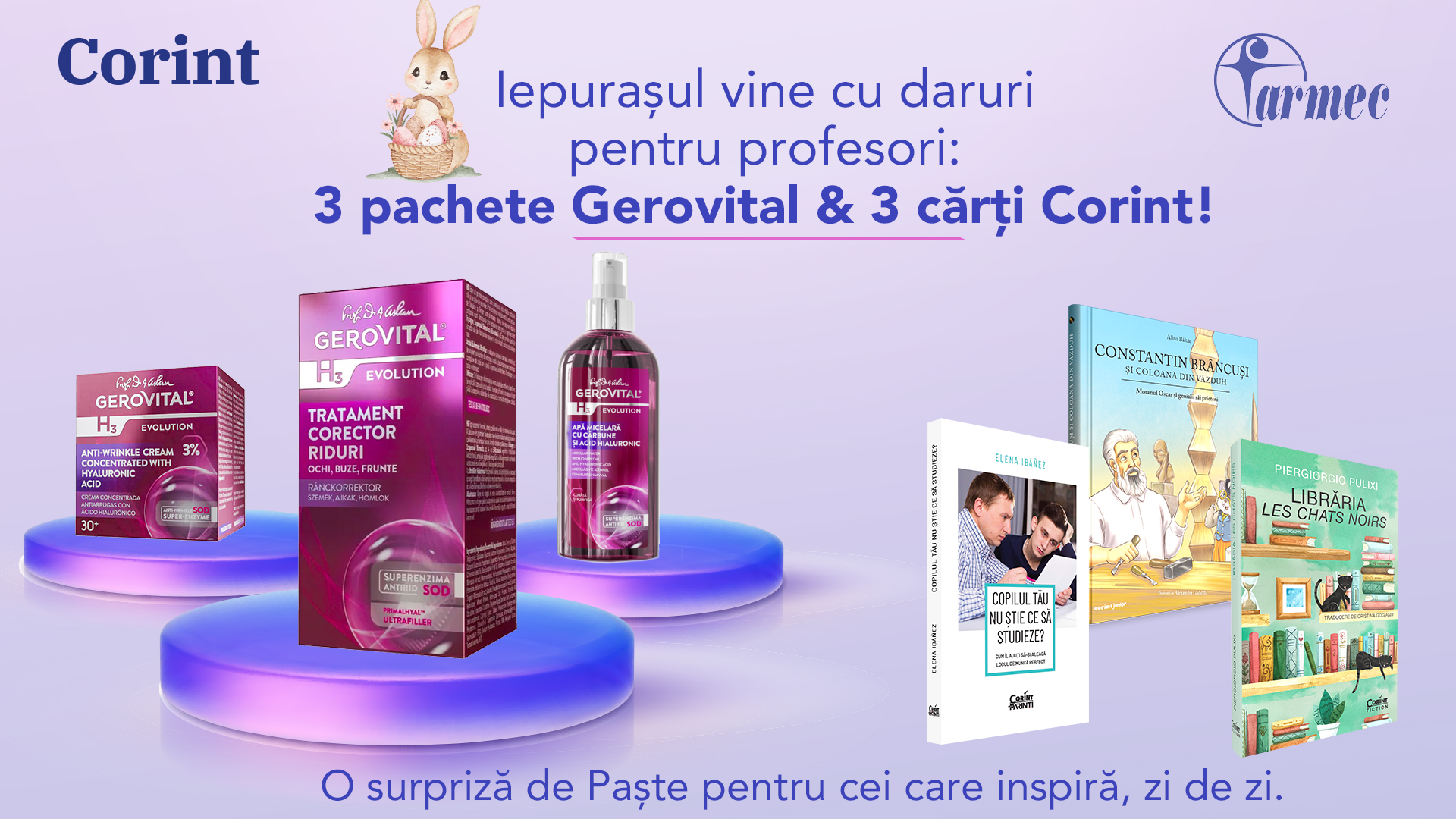 - 3 PACHETE-CADOU GEROVITAL, oferite de partenerii noștri, pregătite să aducă zâmbet, bucurie și un strop de strălucire în această primăvară.